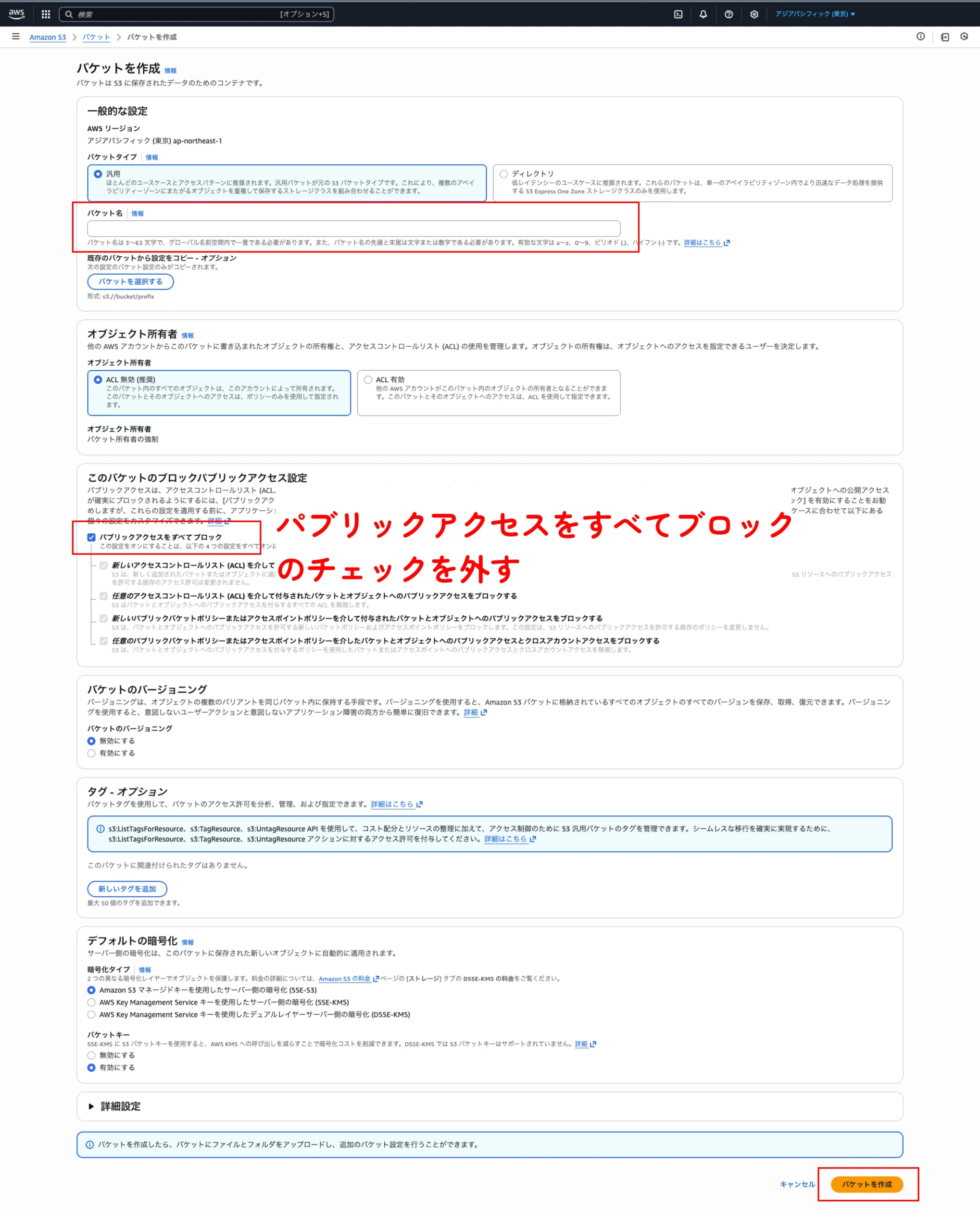 バケット名を決め、パブリックアクセスをすべてブロックのチェックを外します。