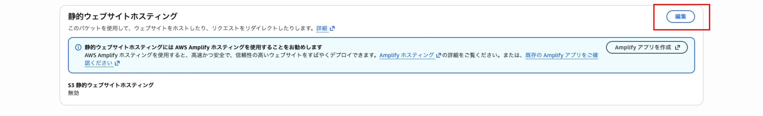 プロパティ項目の一番下「静的ウェブサイトホスティング」の編集をクリック。