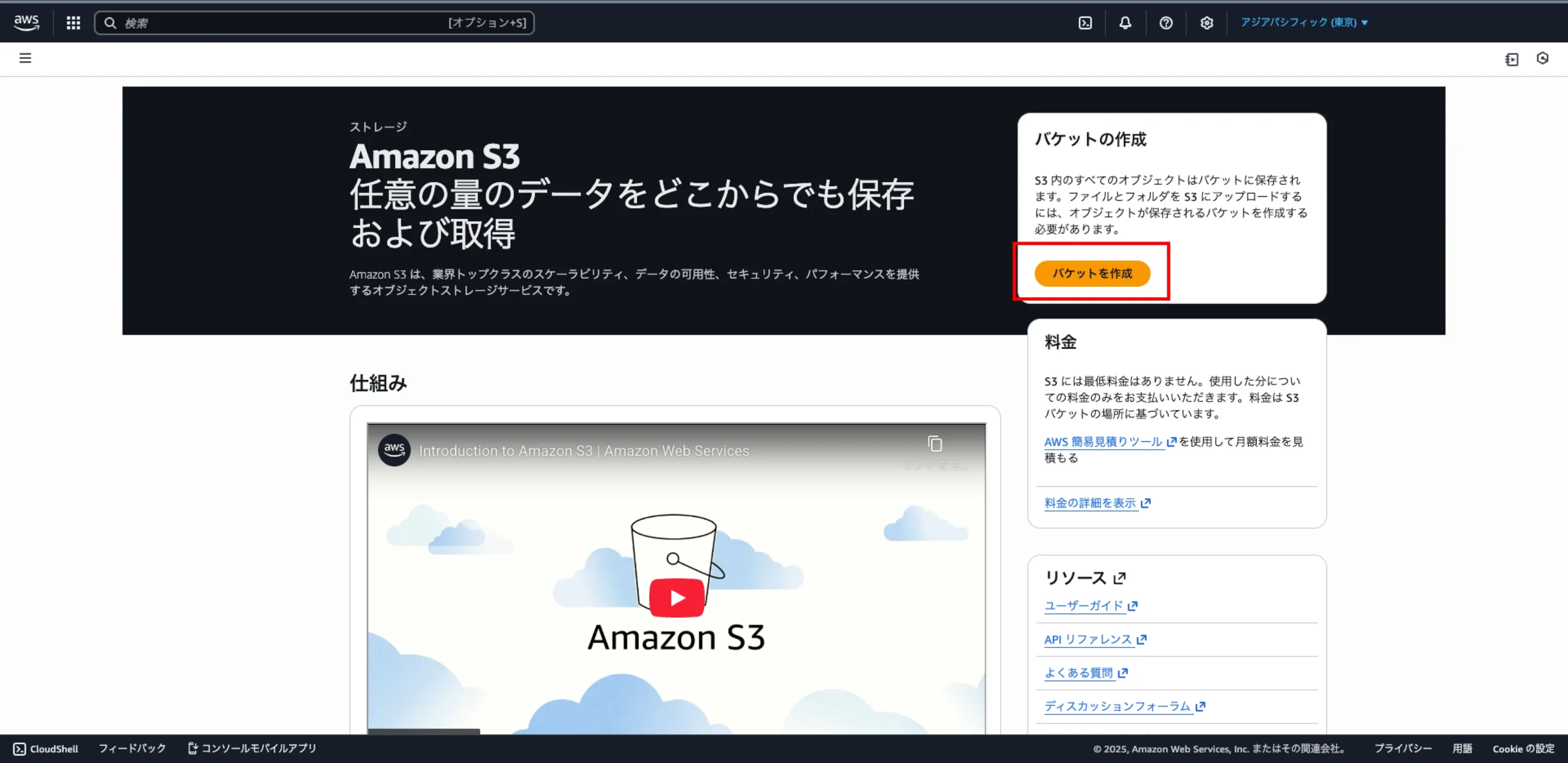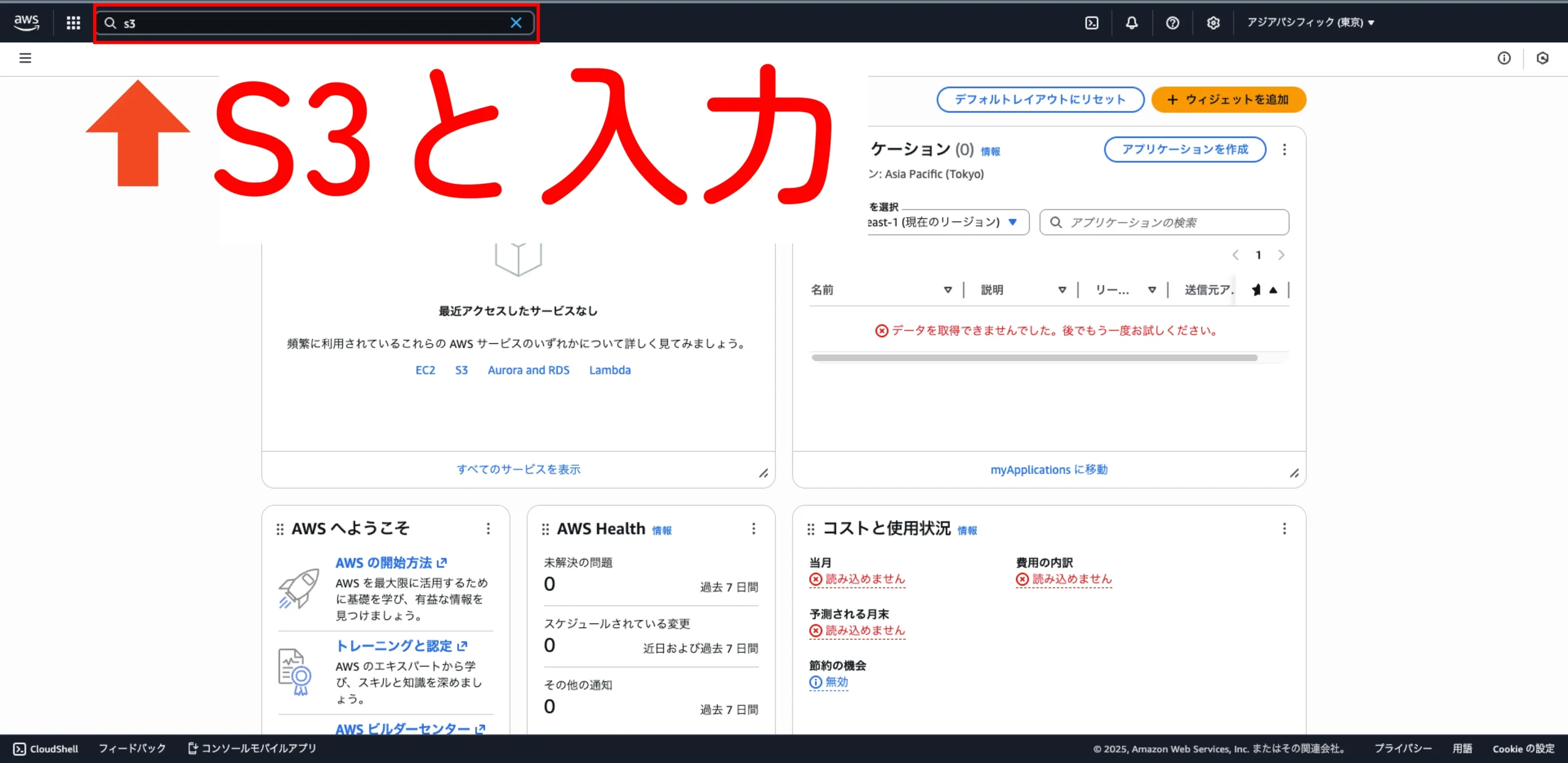 S3のサービスを利用します。左上の検索窓から「S3」と検索してください。