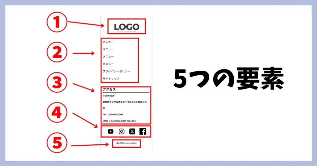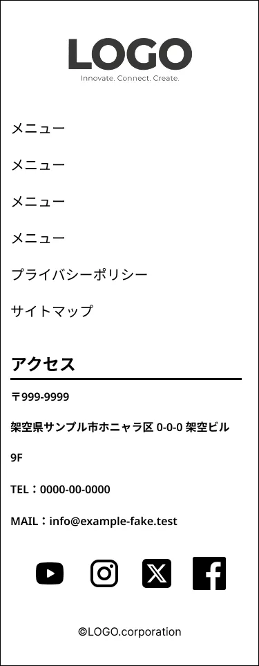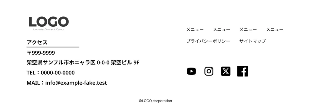 フッターにはロゴ、メニュー、お問い合わせボタンやSNSボタン、サイトマップにプライバシーポリシー、©などたくさんの情報が集まっています。