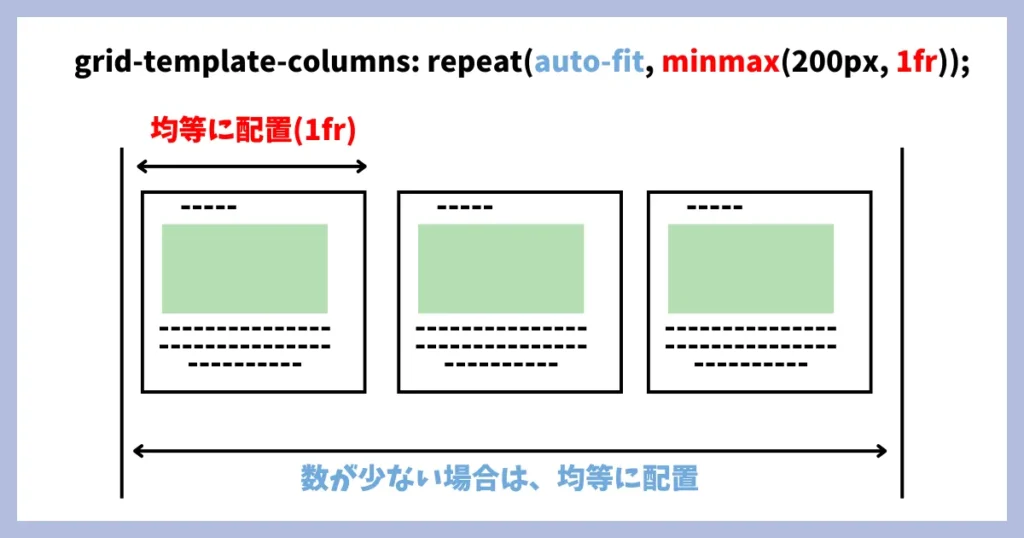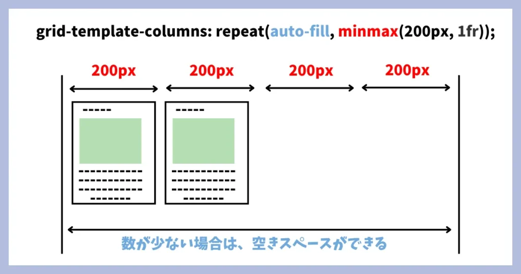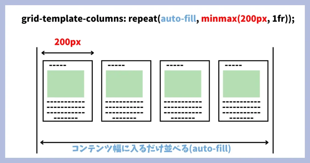 grid-template-columns: repeat(auto-fill, minmax(200px, 1fr));- 200pxより小さくならない