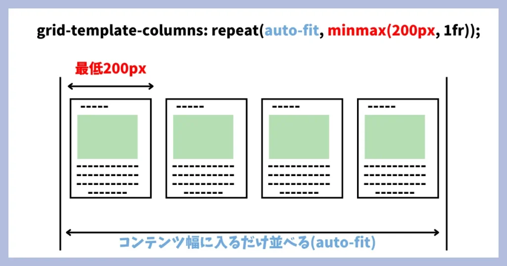 grid-template-columns: repeat(auto-fit, minmax(200px, 1fr));これを覚えておけば