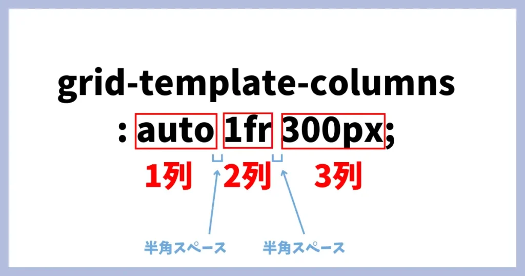 }grid-template-columns、grid-template-rowsの値は半角スペースを開けて決まった単位を指定します。