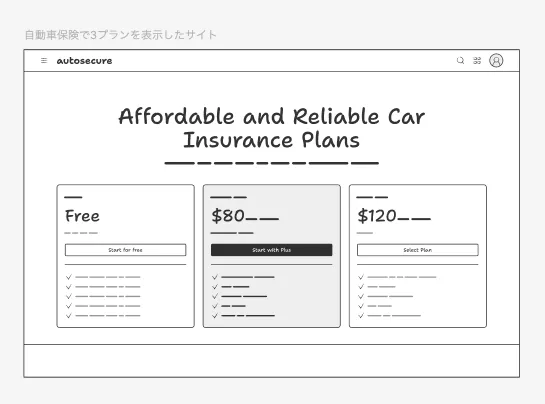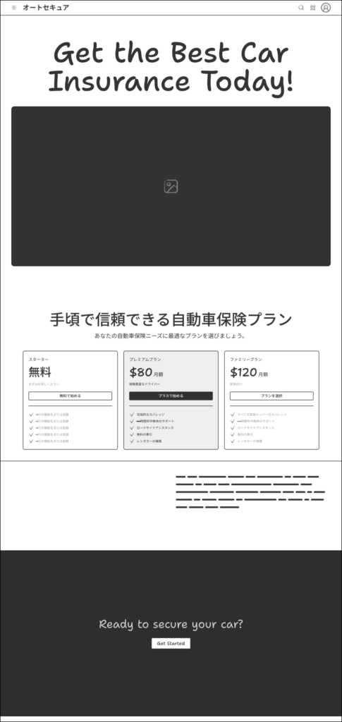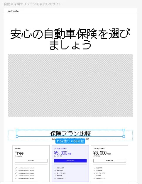 試しに基本サイトで自動車保険で3プランを表示したサイトと指示を出し作ってみます。