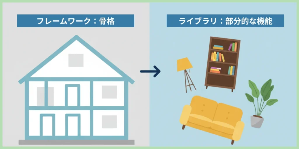 サイトに必要な機能を部分的によそからもってくるイメージです。枠組みであるフレームワークとはまた違った使い方をされます。