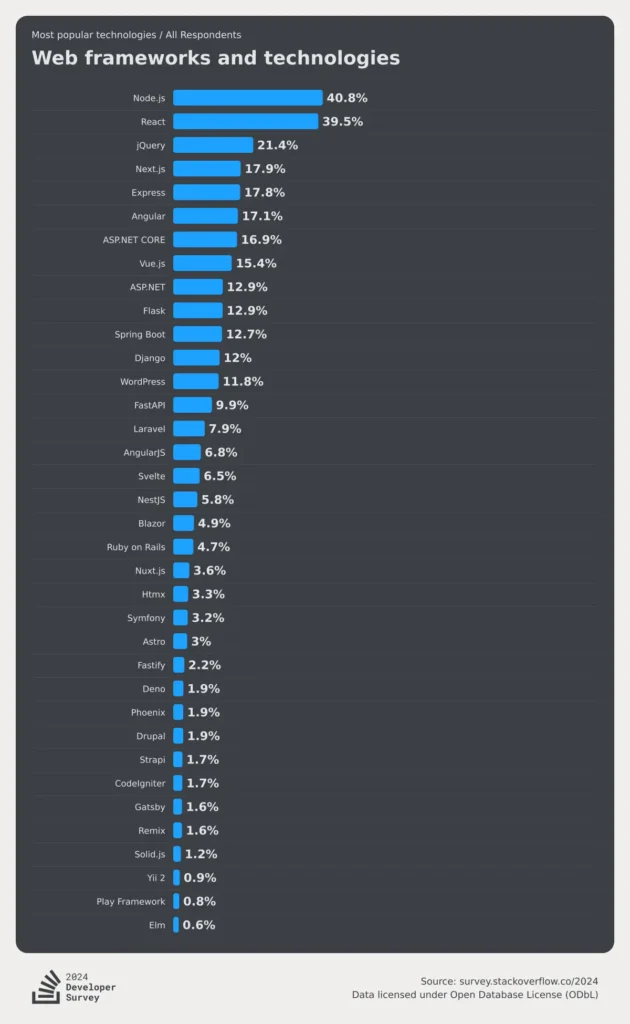 2024年版ですがWebフレームワーク、ライブラリでよく使われているものです。上位ほどよく使われています。