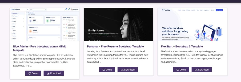 下の画像のようなテンプレート集が多数あるのも特徴のBootstrapですが、使用したデザインはわかりやすいかもしれませんね。