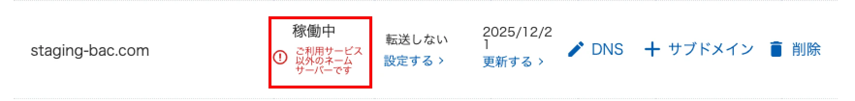 今回のトラブルはネームサーバーの結びつきが出来ていないよ!という警告で出てきました。
