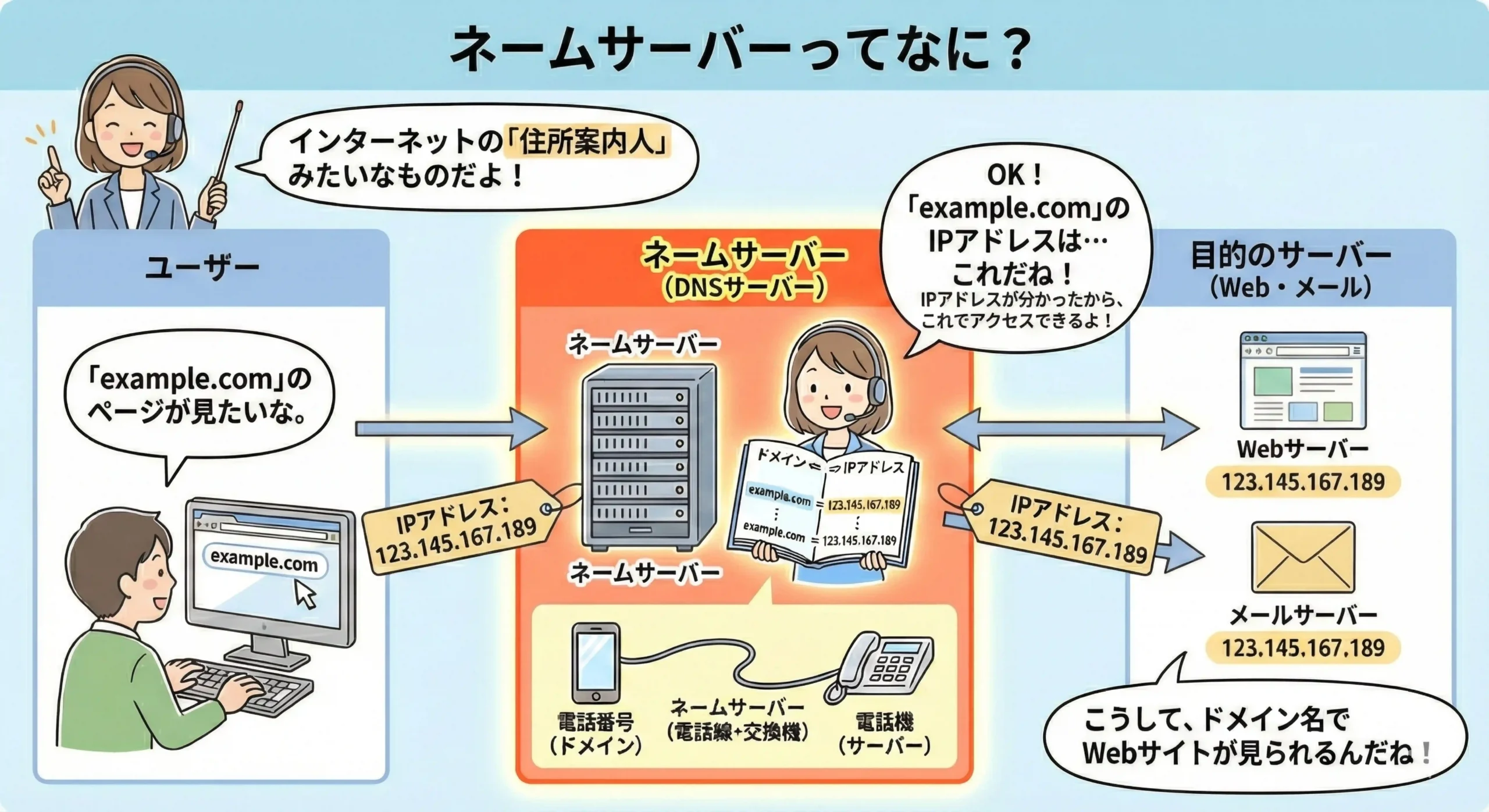 ネームサーバーとは、インターネット上でドメインとWebサーバーやメールサーバーを結びつけるための名前解決をするサーバーです。