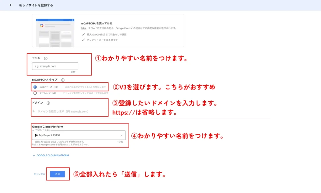 - Googleの設定画面から ラベル・reCAPTCHAタイプ・ドメイン・Google Cloud Platform名を入力