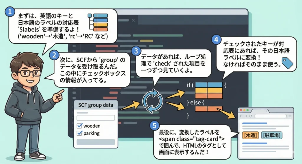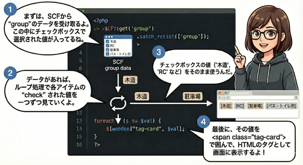そのためにエラーの解除と◯◯ができるコードを出力してください。SCF(Smart Custom Fields)のチェックボックスについて:まとめ