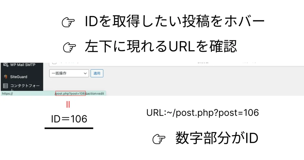 IDがわからないときは、WordPress管理画面の投稿編集URL(例:post=123)から確認できます!