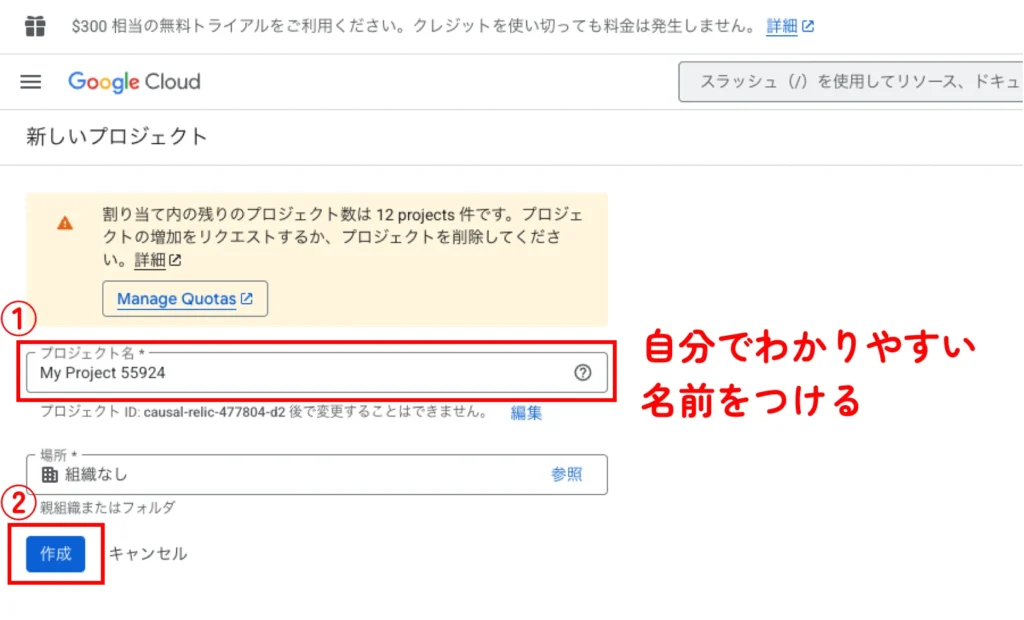 新しいプロジェクトと出ますので、管理するサイト名や、自分で使いやすい名前に設定します。