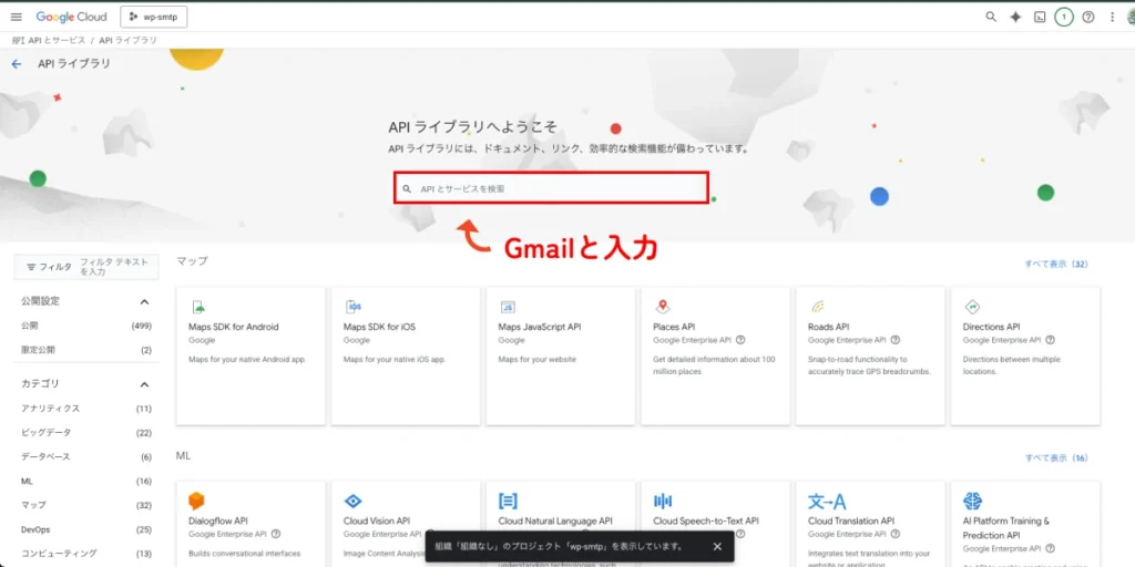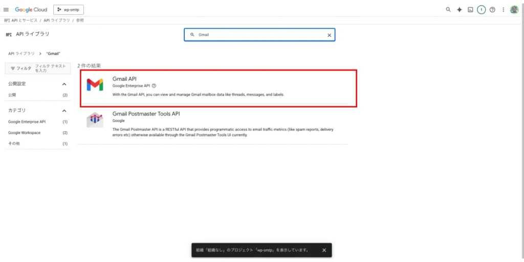 検索結果が現れますので、Gmail APIを選択します。