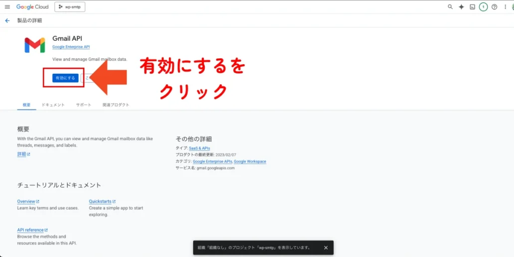 GmailAPIのページが出ますので、有効にするをクリックしましょう。