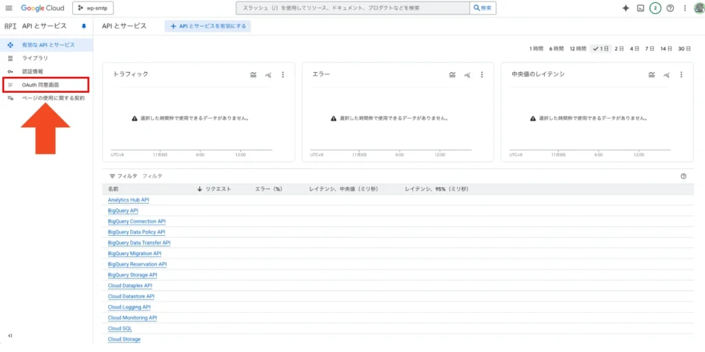 APIとサービスを選び、左のメニューから「OAuth同意画面」を選びます。