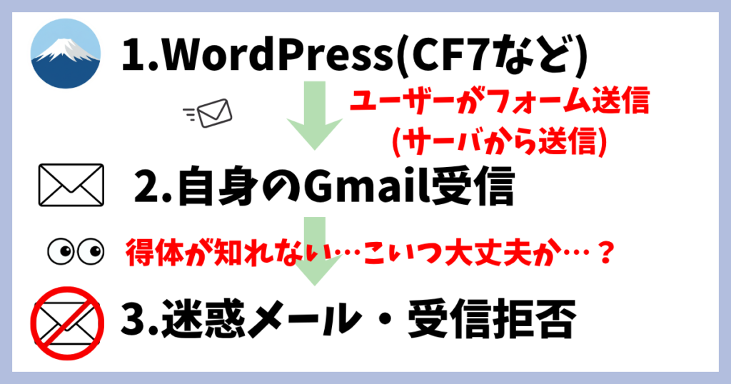 WordPressは内部でPHP mail()を使ってメールを送信していますが、Gmail側からすると「こいつホントに大丈夫か?」となってしまうようです。