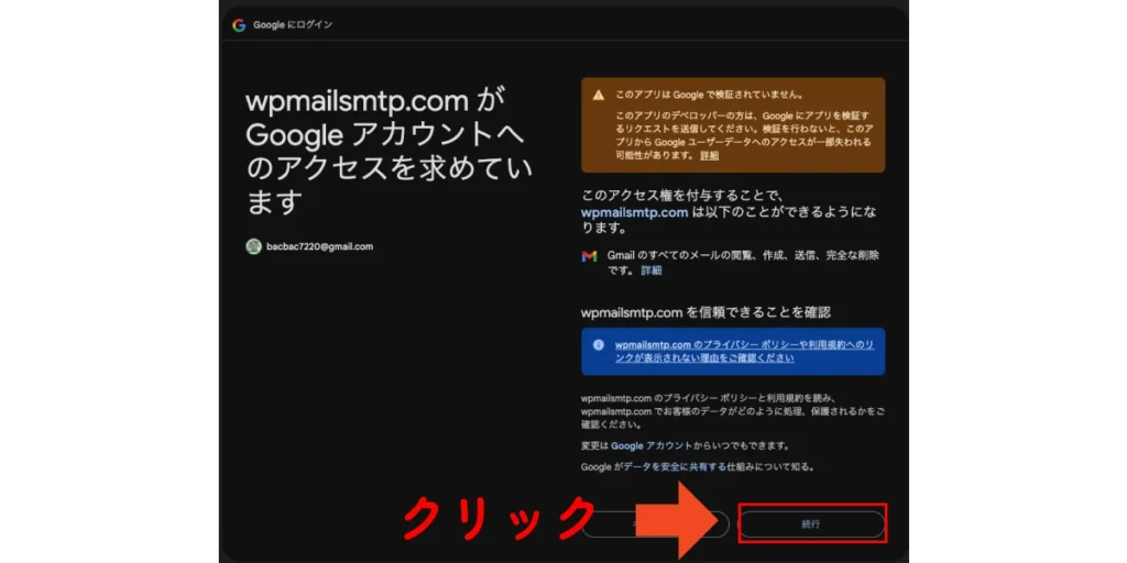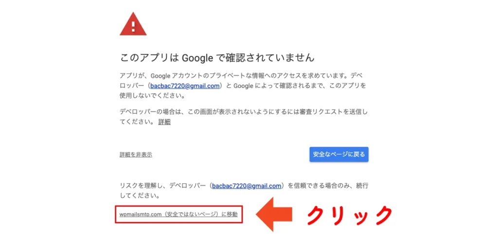 すると、隠れていた部分が表示されるので、「wpmailsmtp.com(安全ではないページ)に移動」としてください。