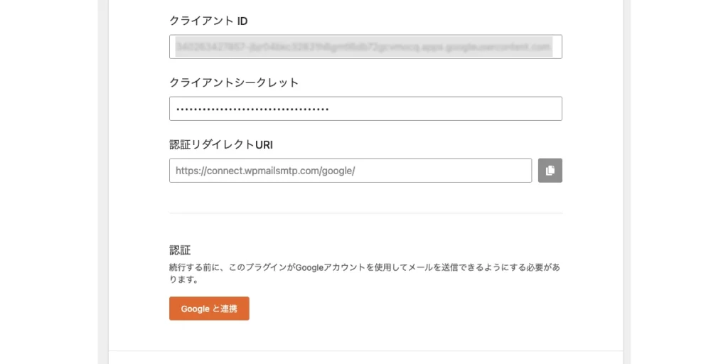 https://connect.wpmailsmtp.com/google/こちらを以下の箇所に入力しておく必要があります。