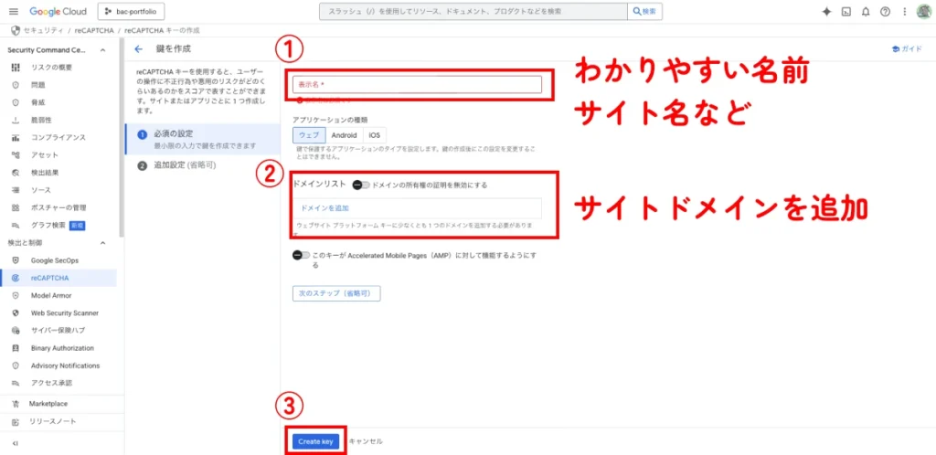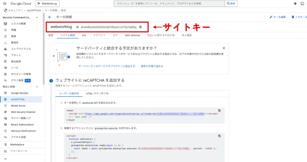 ステップ2:Google Cloud Consoleでサイトキー、シークレットキーの発行