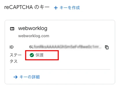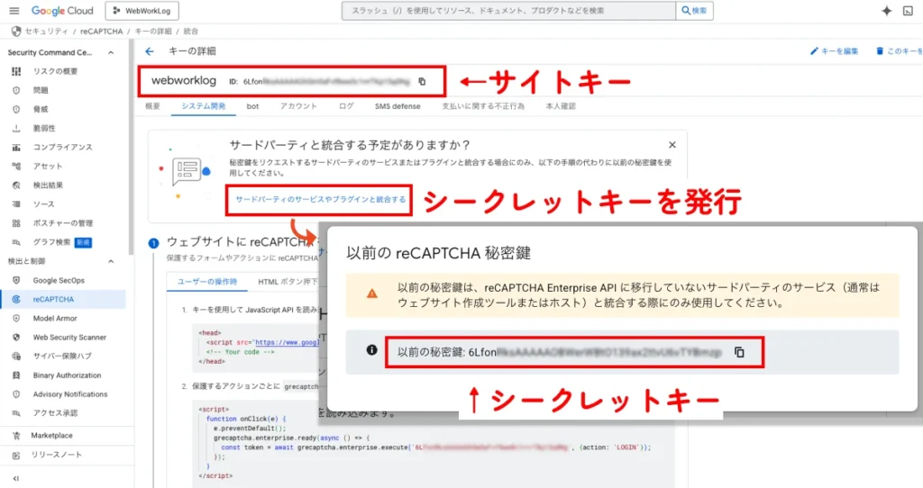 するとシークレットキー(以前のreCAPTCHAの秘密鍵)が表示されます。